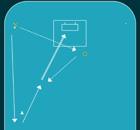 4. Spelare 2 väntar in rörelsen och spelar tillbaka bollen snett in framför mål.