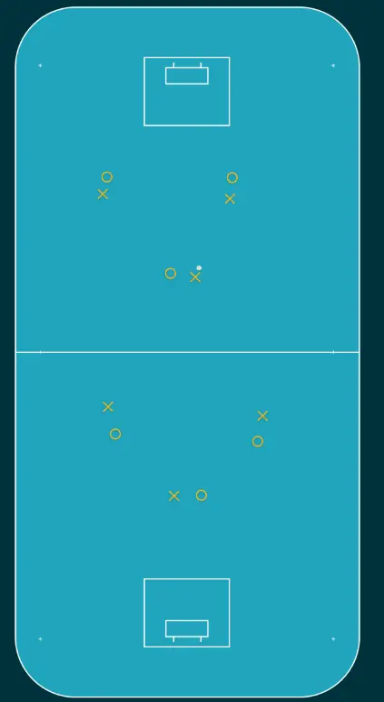 Start i hörn på båda sidor, back halvvägs vid mitten. Forward börjar med ett pass till back och får tillbaka bollen för att sedan köra 1 vs 1
