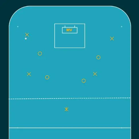 Forwards ställer upp vid var sin kant ute vid sargen på mitten, backen framför mål.