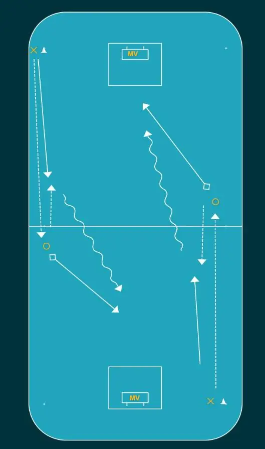 Innebandyövning som tränar forwards på att ta löpning framför mål, ta emot pass från back och avsluta med styrning eller vändning. Denna övning fokuserar på att träna forwards i rörelse in mot mål, styrning eller mottagning och avslut. Forward startar ute vid sargen och tar en explosiv löpning in mot målområdet. Samtidigt slår en back en hård passning in framför mål. Forwarden ska antingen styra bollen direkt eller ta emot den, vända upp och avsluta.