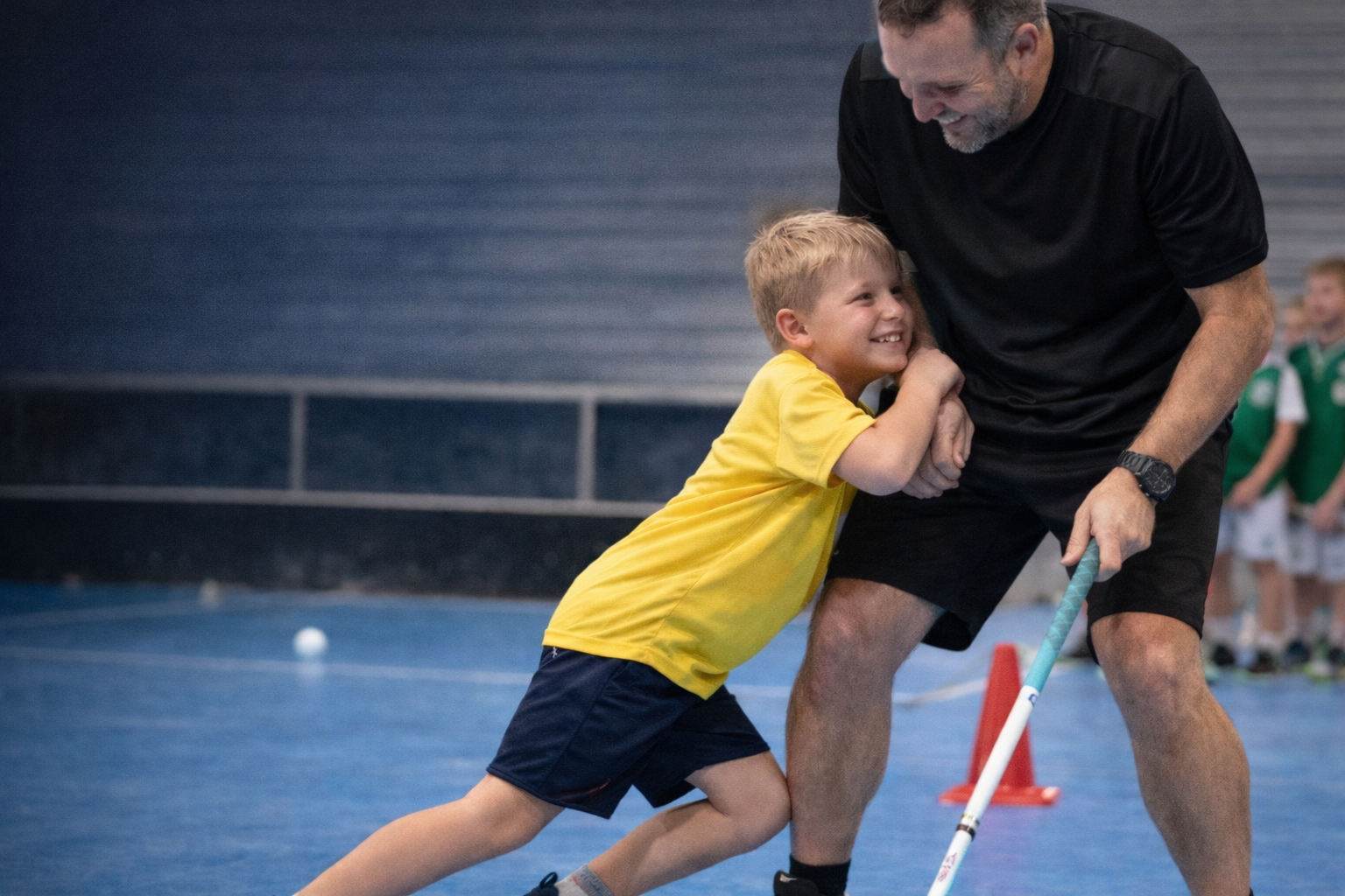 Viktigt: det ska vara lekfullt och tryggt. Tränaren kan förstärka känslan genom att stå stabilt men ändå “låtsas” att det var starkt.